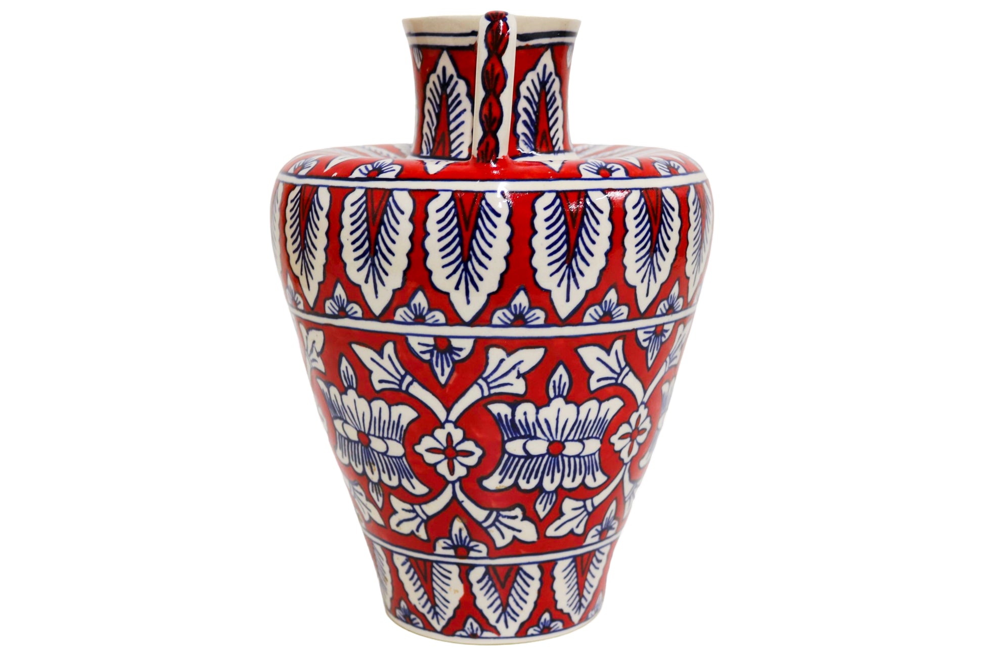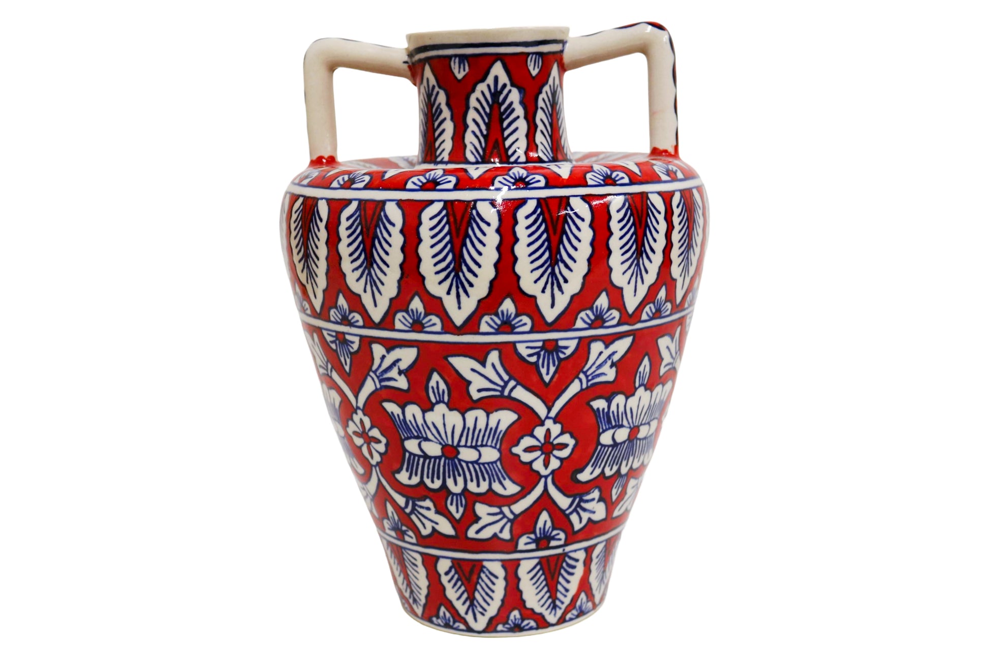 Make a bold statement in your home with this large ceramic vase from Home&Manor! Meticulously hand-painted by skilled artisans, it features a striking red background adorned with intricate white and blue floral and leaf motifs. The traditional amphora-inspired shape, complete with dual square handles, brings both character and timeless elegance to your décor. Perfect as a standalone centerpiece or styled with fresh or dried arrangements, this vase effortlessly blends artistry with functionality. Its vibrant colors and detailed craftsmanship make it a versatile addition to any living room, dining area, or entryway.
