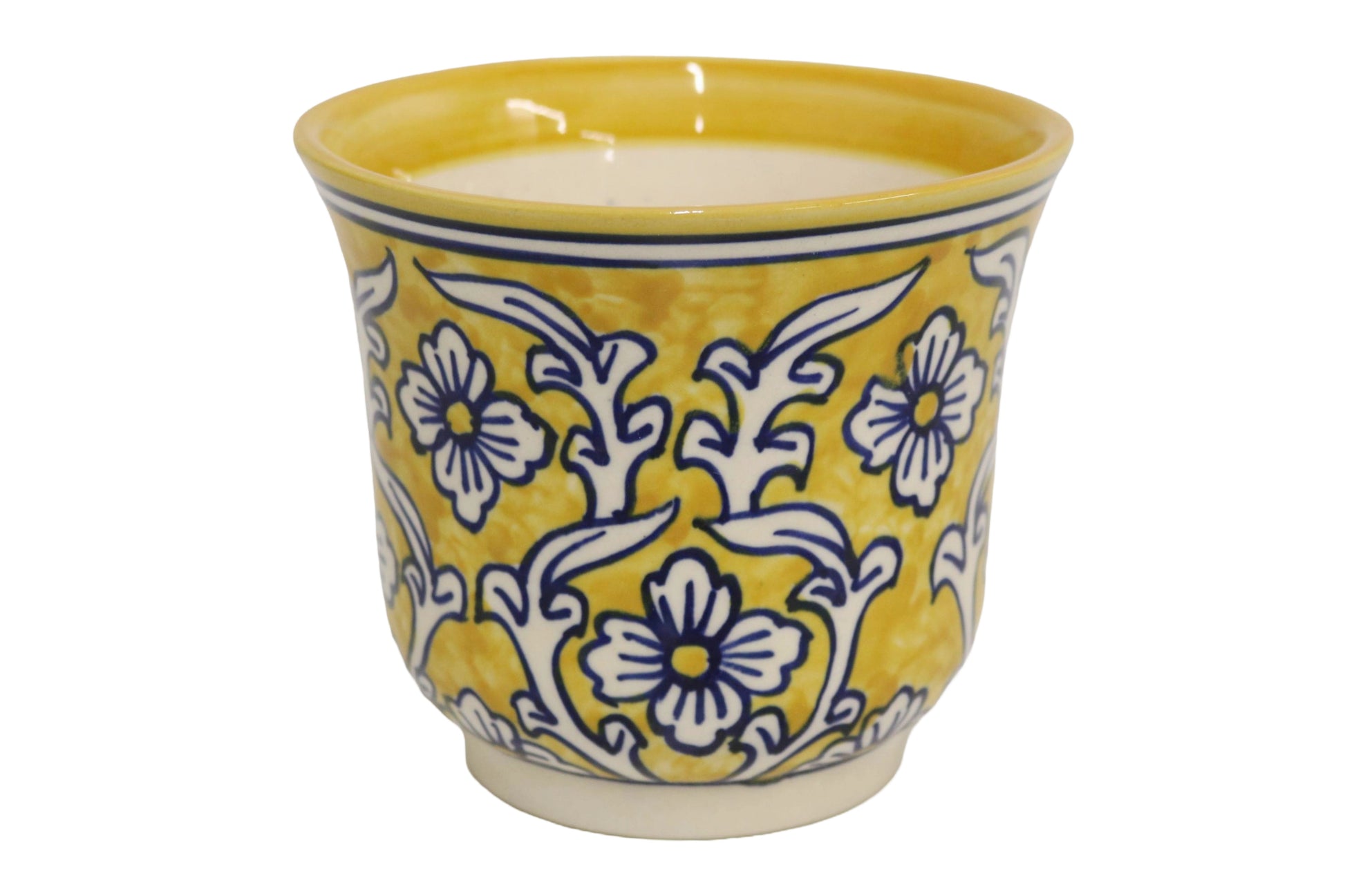 Bring color and charm into your home with this brand new hand-painted ceramic planter from Home&Manor! Featuring an intricate white and blue floral design over a bold yellow backdrop, each piece is crafted with care by skilled artisans, ensuring a one-of-a-kind design. Its bold yet versatile look makes it the perfect accent for any décor style, from bohemian and eclectic to modern and classic. The planter’s compact size makes it ideal for tabletops, shelves, or windowsills—perfect for housing small plants, succulents, or herbs. Whether used as a functional piece or as a decorative accent on its own, this ceramic planter adds artistry and warmth to any space. *Does not have a drain hole*