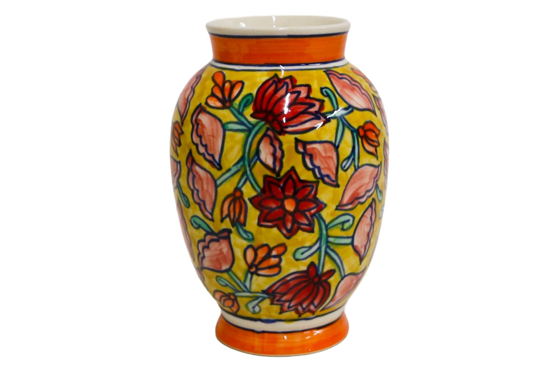 Bring timeless elegance into your home with the Home&Manor Classic Ceramic Vase! Meticulously hand-painted by skilled artisans, this vase showcases a traditional rounded silhouette, beautifully adorned with a multicolor floral motif over a bold yellow backdrop. The rich detailing and high-quality ceramic finish make it a striking statement piece, whether displayed on its own or filled with fresh or dried arrangements. With its classic form and artisanal charm, this vase seamlessly complements both traditional and modern interiors, making it a perfect addition to any home décor.