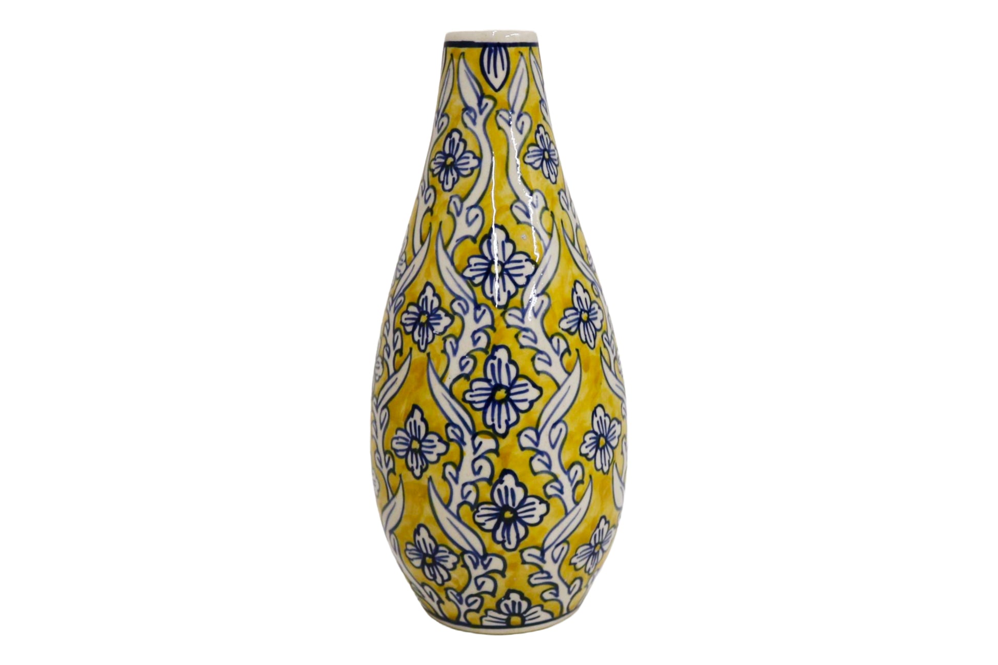 Add a touch of artistry and elegance to your home with the Home&Manor Hand-Painted Ceramic Slim Vase. Featuring a unique elongated teardrop silhouette, this vase is meticulously hand-painted with intricate blue and white floral patterns over a bold yellow backdrop. Its refined design and distinct shape make it a standout piece, perfect for displaying fresh blooms, dried arrangements, or as a striking decorative accent on its own. Crafted from high-quality ceramic, this vase blends timeless craftsmanship with versatile style, making it a perfect addition to any home décor—from modern minimalism to classic tradition.